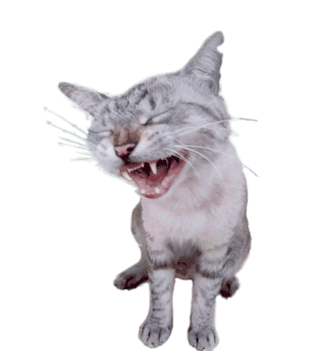 A grey and white tabby cat sits and laughs heartily with its eyes closed and mouth wide open, showing its teeth.