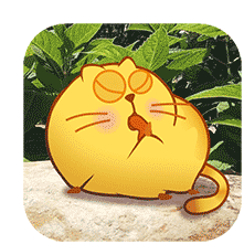 A cute, chubby yellow cartoon cat with rosy cheeks is sleepily licking its paw while sitting on a rock.