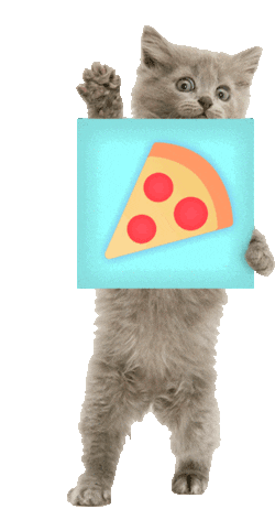 A fluffy grey kitten stands on its hind legs, holding a light blue sign with a slice of pizza, looking surprised.