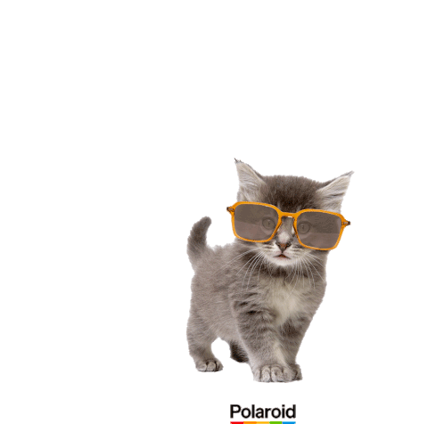 An adorable grey kitten wearing orange Polaroid sunglasses, with text 'Miwowww, It's Sustainable!' appearing. Perfect for eco-friendly vibes.