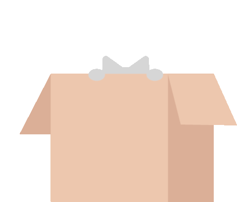A cute cartoon cat peeks out from a cardboard box, revealing its face before playfully hiding again.