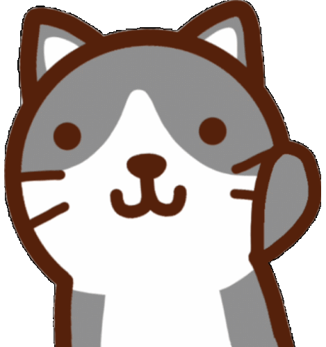 A charming animated sticker featuring a cute grey and white cartoon cat happily waving its paw, perfect for expressing a friendly greeting.