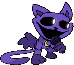 Catnap, the purple cat with a crescent moon on its chest, holds a microphone, ready to sing.