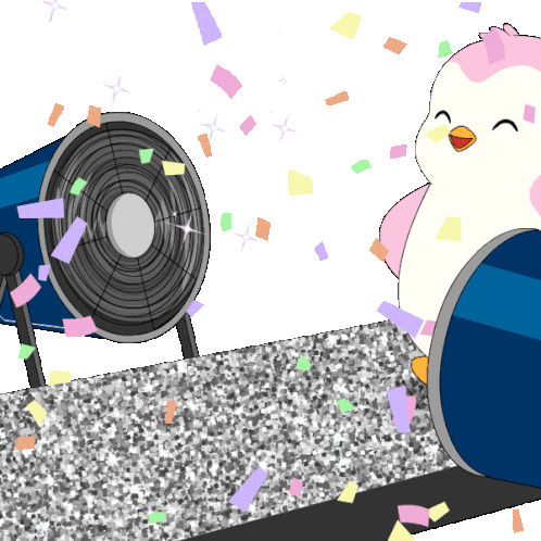 a cartoon of a penguin standing next to a fan with confetti coming out of it
