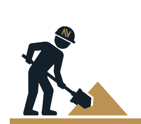 A stick figure worker in a hard hat with a 'Nova C' logo diligently shoveling a pile of sand.