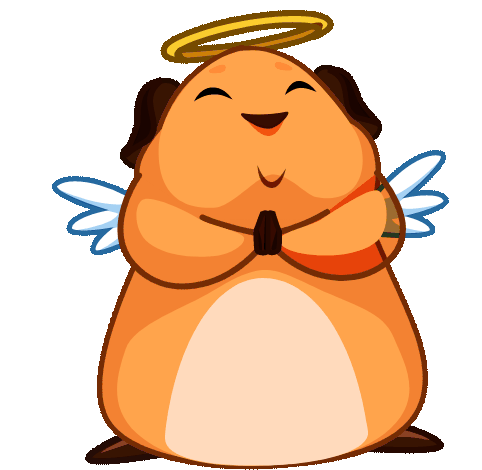Cavy Saint, an adorable angel hamster, prays with clasped hands, then playfully adjusts its golden halo.