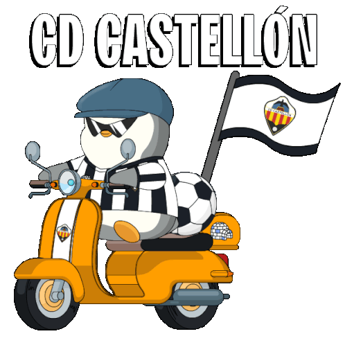 a cartoon penguin is riding a scooter with a soccer ball on the back and the word castellon above him