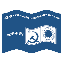A blue flag representing the Portuguese Unitary Democratic Coalition (CDU), featuring the hammer and sickle and a sunflower.