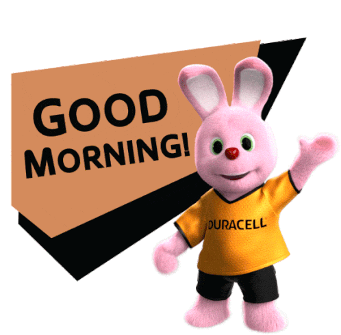 Cece, the pink Duracell bunny, waves its arms with a cheerful 'Good Morning!' message.