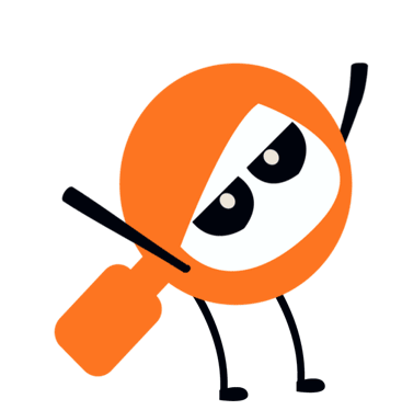 Cekpremi, the orange magnifying glass character, performs an energetic and happy 'joget' dance move with raised arms.