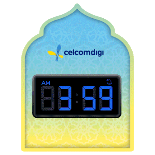 Animated CelcomDigi sticker showing a Sahur countdown clock in an Islamic archway, ending with 'Blessed Sahur'.