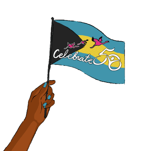 A hand waves a Bahamian flag celebrating 50 years, featuring 'Celebrate 50' text and flamingos. Perfect for national pride.