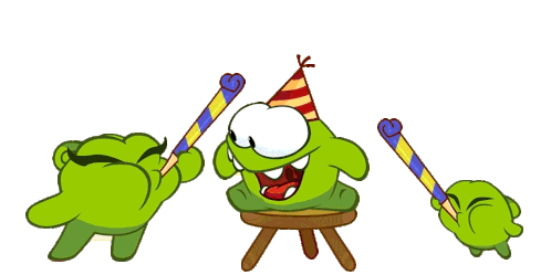 Om Nom, Om Nelle, and Nibble Nom celebrate joyfully with party hats and blowers, laughing together.