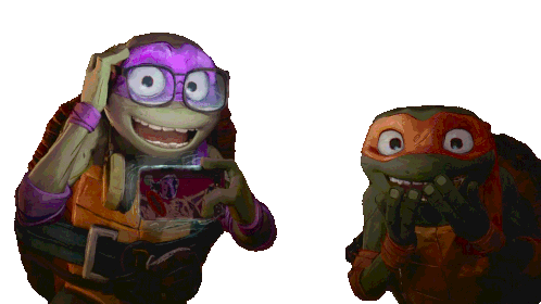 Donatello and Michelangelo from TMNT Mutant Mayhem celebrating joyfully, sharing a happy hug.