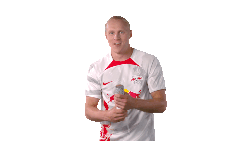 Xaver Schlager, wearing his RB Leipzig jersey, joyfully celebrates with a burst of confetti from a party popper.