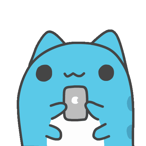 A cute blue cartoon cat-like creature holding a smartphone, becoming excited with red hearts floating around it.