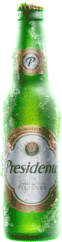 A frosty green bottle of Presidente beer with a silver label, perfect for a festival or music event.