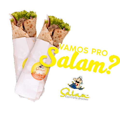An animated sticker featuring two delicious Arab food wraps and the question 'Let's go to Salam?' with a changing text color.