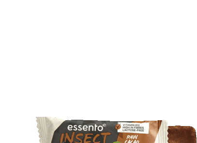 An Essento Insect Protein Bar in Raw Cacao flavor, highlighting its high protein, fiber, and Vitamin B12 content, made in Switzerland.