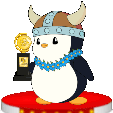 A cute cartoon penguin wearing a viking helmet and a blue lei, proudly holding a golden trophy on a red podium.