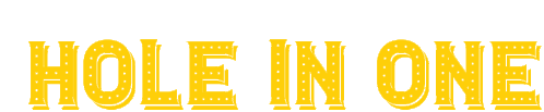 A vibrant yellow sign with dotted letters spells out 'Hole In One' for Champions Golf.