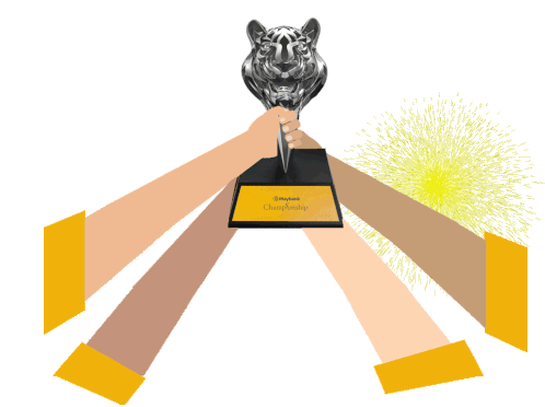 A gleaming Maybank Championship golf trophy, featuring a tiger head, held high in celebration of victory.