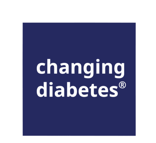 Animated logo for "changing diabetes®", transitioning between a purple square and a red heart shape.