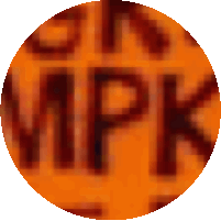 A blurry orange circle sticker featuring the letters 'MPK', associated with the classic Charlie Brown Great Pumpkin theme.