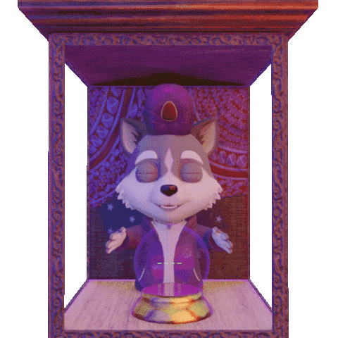 An animated husky character in a purple robe and hat displays a dynamic green crypto chart, smiling and making peace signs.