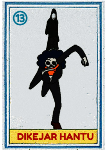 A skeleton character, resembling Brook, is comically chased by a spooky ghost, with the phrase 'Dikejar Hantu'.