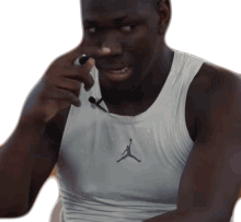 Kofi Cockburn peeks through his fingers, then points to his eye, giving a sly "I'm watching you" look.