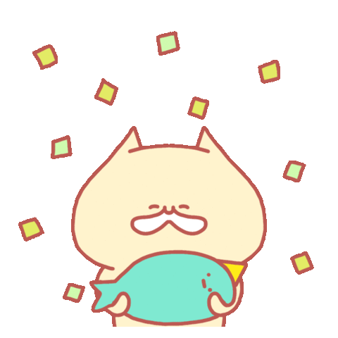 A cheerful cat-like character with a happy fish-bird and falling confetti, celebrating with enthusiasm. Perfect for cheering and congratulations.