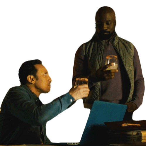 Ben Shakir (Aasif Mandvi) and David Acosta (Mike Colter) from Evil share a toast with drinks.