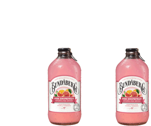 Two bottles of Bundaberg Pink Grapefruit sparkling drink clink together in a celebratory cheers, featuring the iconic Australian beverage.