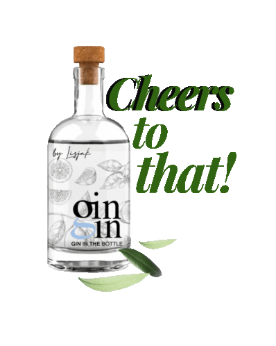 A bottle of Lisjak gin with the text 'Cheers to that!' and green leaves, perfect for celebrating and toasting.