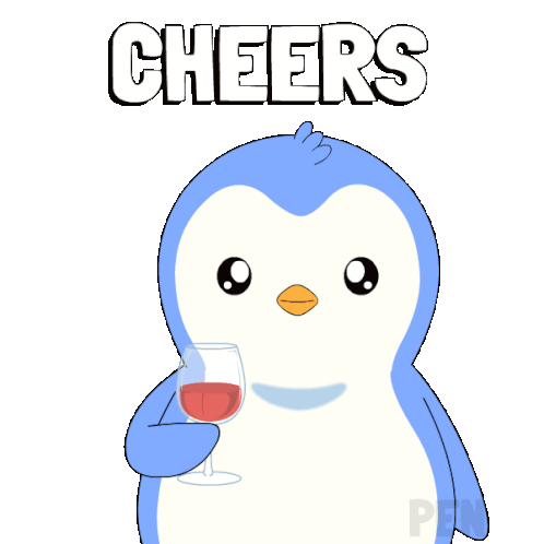 a penguin holding a glass of red wine with the word cheers behind it
