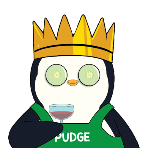 Pudgy Penguin wearing a crown and 'PUDGE' apron, relaxing with cucumber eyes and a drink, ready to toast.