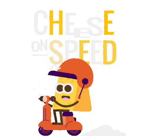 A cute cheese character wearing an orange helmet, riding an orange Vespa scooter with the text 'Cheese On Speed'.