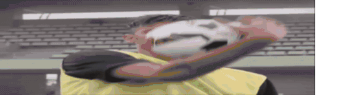 a man in a yellow shirt is holding a soccer ball over his face .