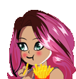 Animated sticker of Cherryberlin, a cartoon girl with pink hair, happily eating french fries from a red carton.