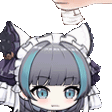 Cheshire from Azur Lane, a cat maid character with blue hair, holding a small white cat with a surprised expression.