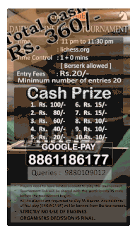 Chess Hub Daily Online Bullet Tournament flyer with cash prizes totaling Rs. 360, entry fee Rs. 20, and Google Pay details.