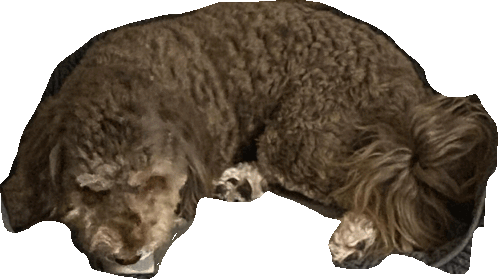 a dog is laying down with its head on its paws