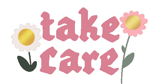Chiaralbart character with a daisy and flowers, spreading a positive 'Take Care' message for well-being.