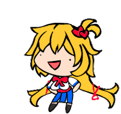 Chibi Haachama (Akai Haato) from Hololive dances energetically, a cute anime girl with yellow hair and a red bow.
