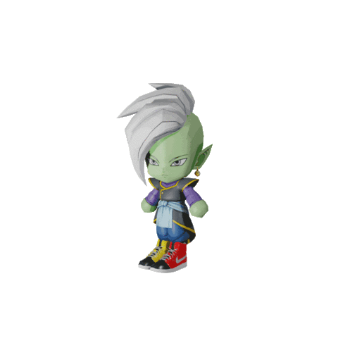 A cute chibi Zamasu from Dragon Ball Z, with green skin and white hair, striking a dynamic pose.