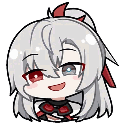 Chibi Alpha from Punishing Gray Raven is shown laughing joyfully with her eyes closed and hands clasped.