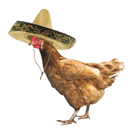 An animated sticker featuring an upside-down chicken with its head in a sombrero hat, spinning around playfully.