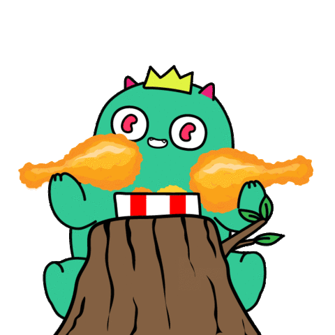 A cute, green monster with a crown happily devours fried chicken legs from a bucket while sitting behind a tree stump.