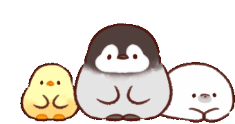 Adorable animated sticker featuring a penguin, chick, and seal bowing or praying together in a cute chibi style.